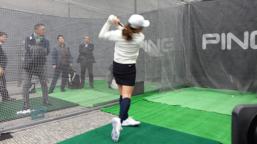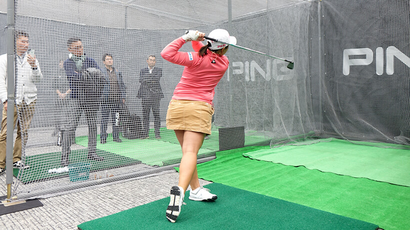 一方のG710アイアンについては「飛び系で見た目も黒でシャープでカッコいいですね。安定して飛距離が出ます」と鈴木プロ。渋野プロは「構えた感じも難しいイメージがなくて、構えやすいですね。ヘッドが大きく見えるので、芯をはずしても飛びそうです」その後、試打ブースでデモンストレーションショットを見せたが、ナイスショットを見せて喜ぶ鈴木プロに対し、渋野プロは2球続けてダフってしまったが、「ダフっても飛びます(笑)」と製品性能をアピール。その後はナイスショットを見せ、7番アイアンで160ヤード以上飛ばし「飛距離を求める人におすすめですね」と笑顔を見せた。
