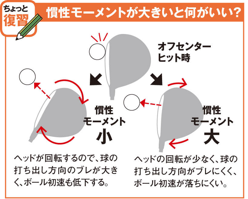 ヘッドの慣性モーメントが大きくなると、オフセンターヒットした時のヘッドの回転が抑えられるので、打ち出し方向の変化が少なく、また、エネルギーロスも軽減される。