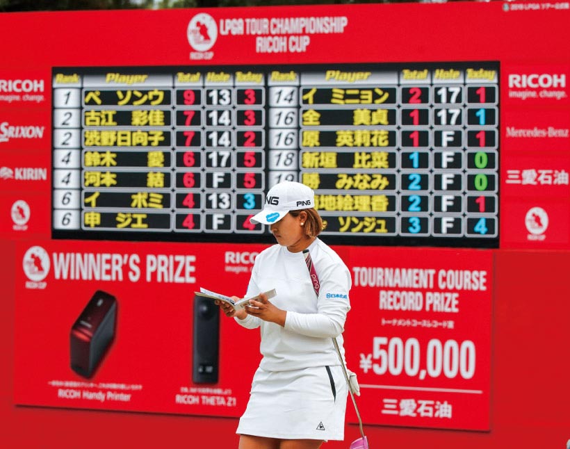 渋野が15番でボギーを打った時点で鈴木愛は5位タイでホールアウトして、賞金女王はぼぼ決まった。優勝争いでは、最終組をトップでスタートしたイ・ボミがスコアを落とす中、2位でスタートしたぺ・ソンウが14番までにスコアを4つ伸ばして、独走状態になっていた。