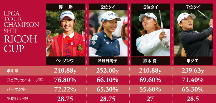 最終スコアはぺ・ソンウが2位タイの渋野に4打をつけて優勝。賞金女王を争った3人と比較しても、ペ・ソンウはフェアウェイキープ率が76%とティショットの安定感が抜群だったことがわかる。逆に3日目まで苦しんでいた鈴木愛は、パーオン率が55%と苦しい中で、年間の平均パット数でも1位だった得意のパッティングでスコアを作っていた。