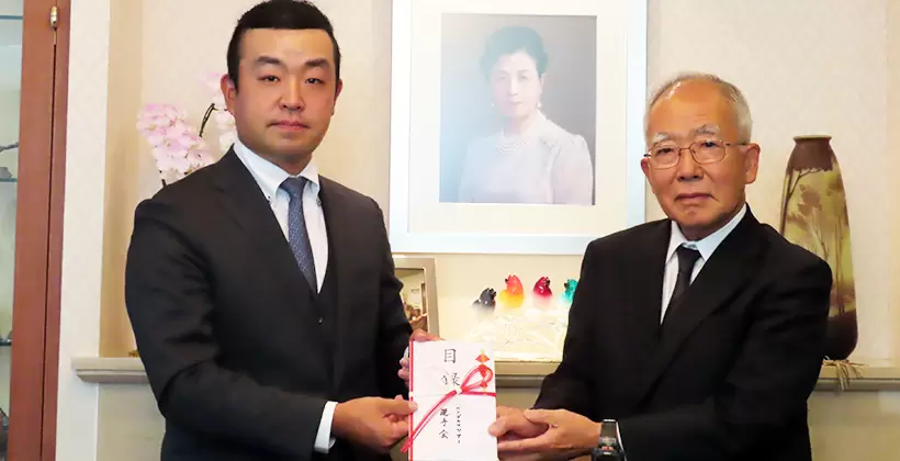 JGTO選手会新会長となった時松隆光プロは、福岡から朝8時初の飛行機に搭乗し、11時から贈呈式が行われた公益財団法人高松宮妃癌研究基金に出席した。贈呈式にはJGTOから小山和顕部長も出席し、時松選手会新会長から、公益財団法人高松妃癌研究基金の関谷剛男理事長に80万円を寄贈した。
