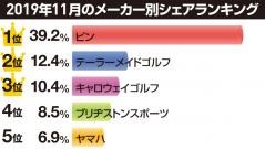 ここ数年のフェアウェイウッド市場の人気モデルは、ドライバーの販売実績に準ずる傾向にある。わかりやすく言うと、ドライバーで1位だったモデルは、フェアウェイウッドでも1位もしくは上位に必ず入っているのだ。11月のランキングを見ても、フェアウェイウッドの1位はピン『G410』で、ドライバーでもトップは『G410』である。両部門において、19年はピンの『G410』が圧勝だった1年と言えるだろう。