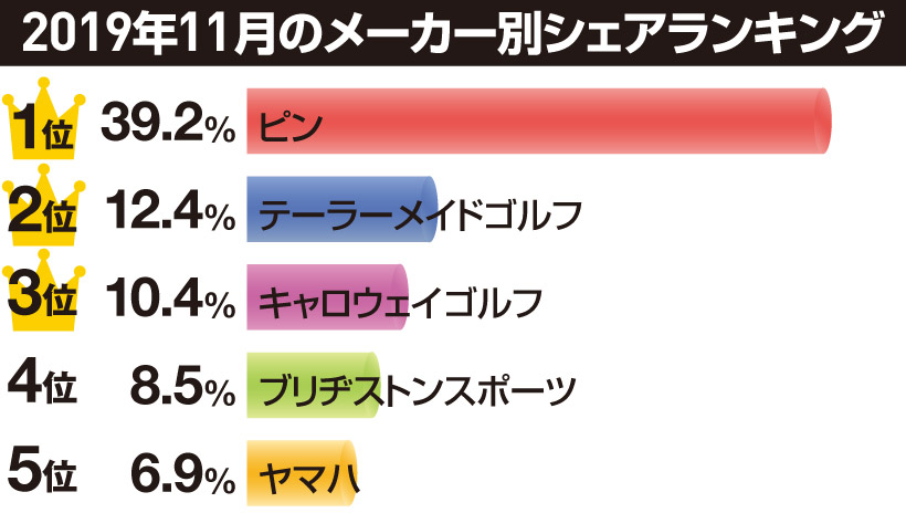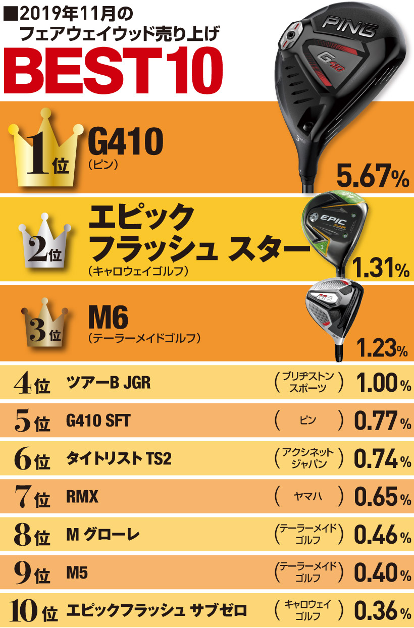 ここ数年のフェアウェイウッド市場の人気モデルは、ドライバーの販売実績に準ずる傾向にある。わかりやすく言うと、ドライバーで1位だったモデルは、フェアウェイウッドでも1位もしくは上位に必ず入っているのだ。11月のランキングを見ても、フェアウェイウッドの1位はピン『G410』で、ドライバーでもトップは『G410』である。両部門において、19年はピンの『G410』が圧勝だった1年と言えるだろう。