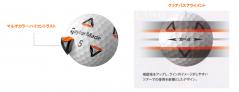 NEW『TP5 pix』ならびに『TP5x pix』は同社ボール契約のリッキー・ファウラーがデザインを監修。パッティング時にボールを目標方向に正しくリプレースするために、「TP5/TP5X」と「TaylorMade」ロゴの位置を調整し、オレンジと黒のコントラスト(マルチカラーハイコントラスト)を配置し、転がるとオレンジと黒のラインが帯となって浮かび上がるクリアパスアライメントを採用することにより視認性が向上。