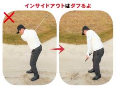 バンカーショットで球を上げようとすると、クラブがインサイドの低い位置から入り手前の砂をダフることになりやすい。