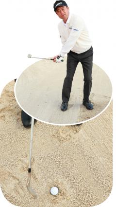 横田 打ち方のポイントは、一般的なバンカーショットと同じで、上からヘッドをドンと砂に打ち込むことです。ただ、普通のバンカーショットよりもヘッドを鋭角に入れていきたいので、アドレスで左足に体重を乗せておき、そのまま最後まで左足体重で打っていくようにします。