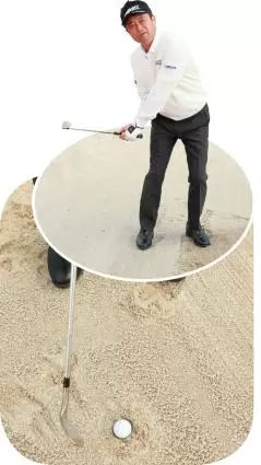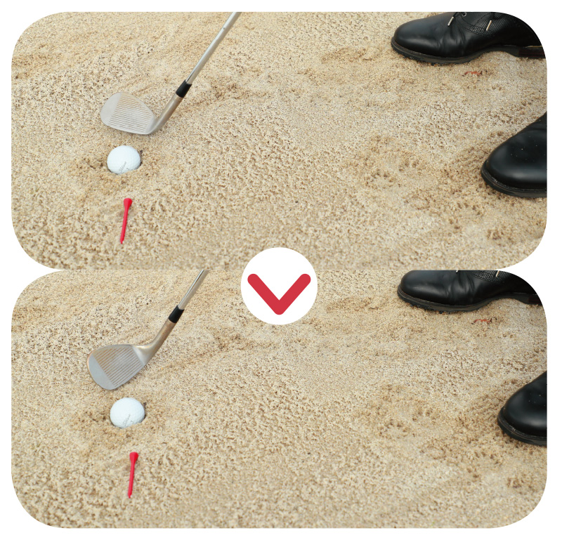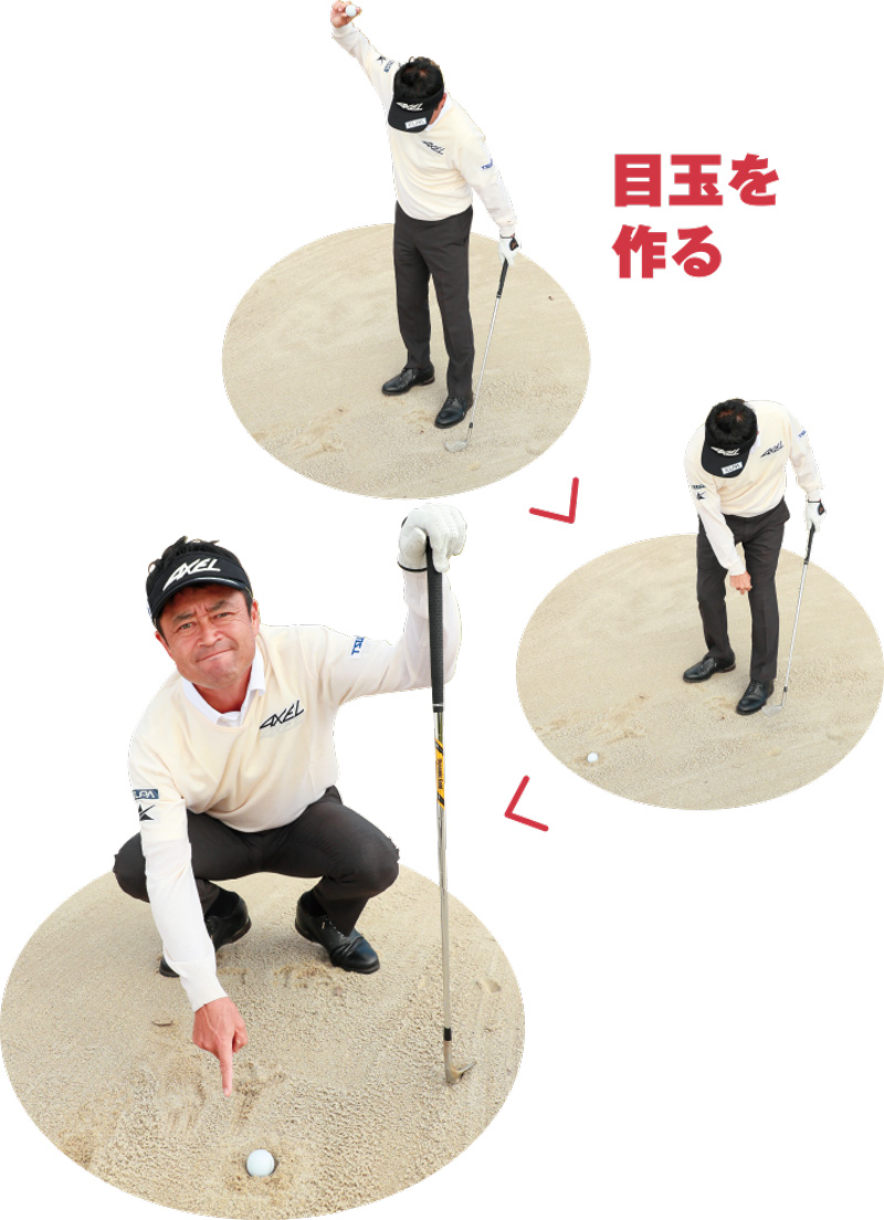 コースや練習場のバンカー練習場で、ボールを上から下に叩きつけて人工の『目玉』を作る。