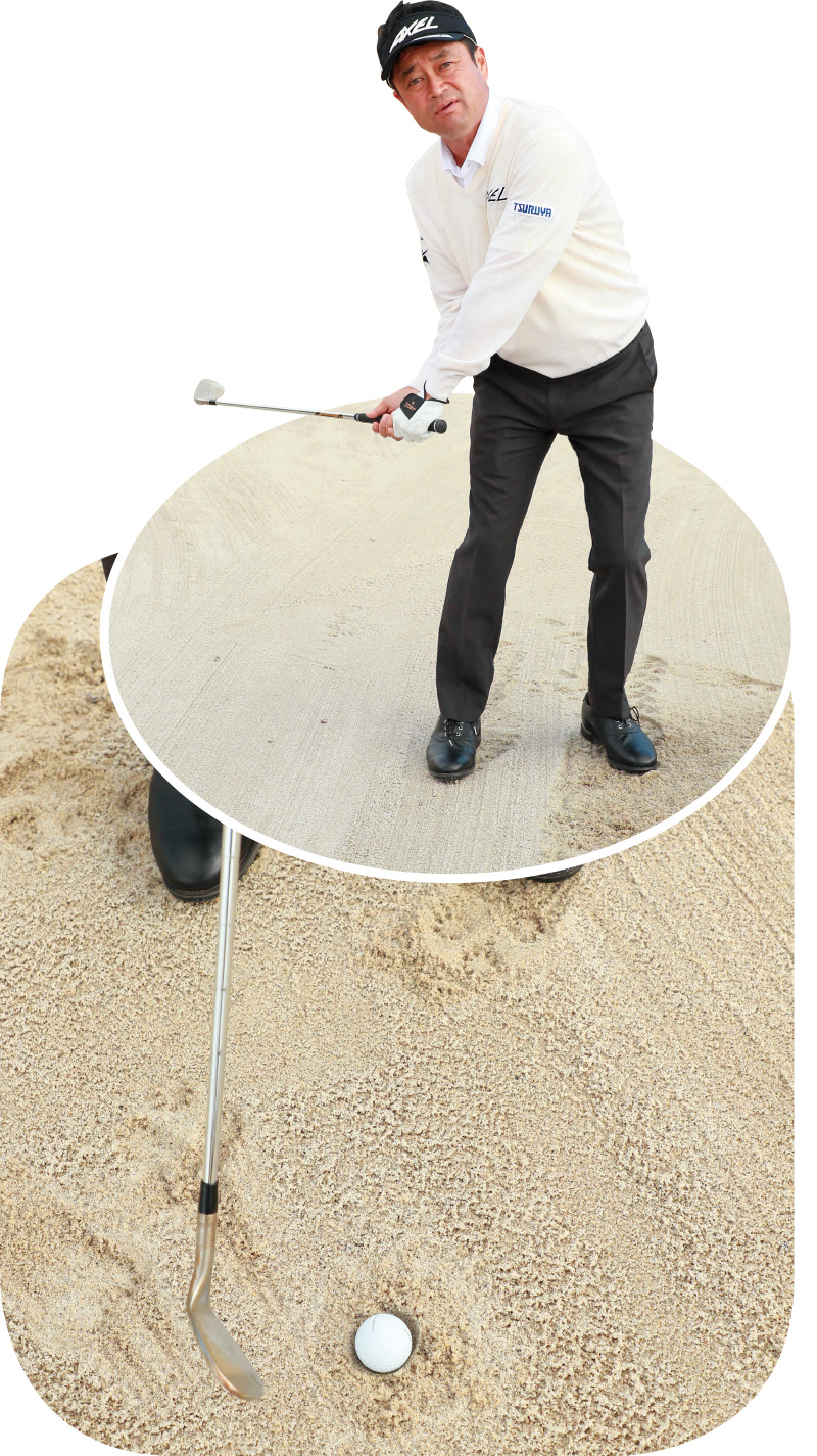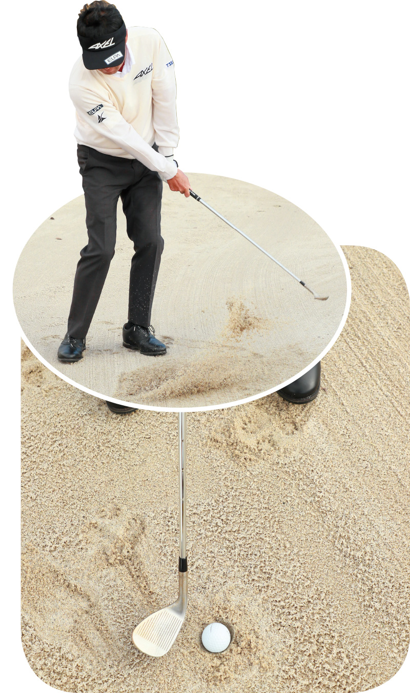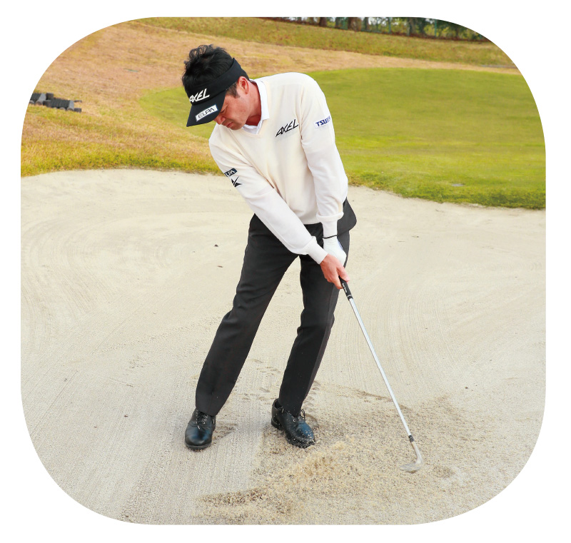 横田 打ち方のポイントは、一般的なバンカーショットと同じで、上からヘッドをドンと砂に打ち込むことです。ただ、普通のバンカーショットよりもヘッドを鋭角に入れていきたいので、アドレスで左足に体重を乗せておき、そのまま最後まで左足体重で打っていくようにします。