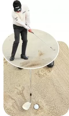 打ち方は一般的なバンカーショットと同じで、上からヘッドをドンと砂に打ち込むだけだが、よりヘッドを鋭角に入れていきたいので、アドレスで左足に体重を乗せておき、そのまま最後まで左足体重で打っていくようにする。