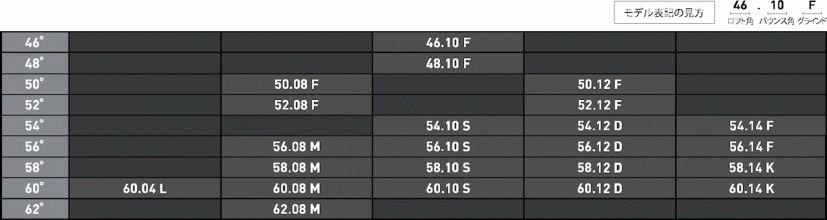 ツアークローム…46°/ 48°/ 50°/ 52°/ 54°/ 56°/ 58°/ 60°/ 62°