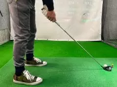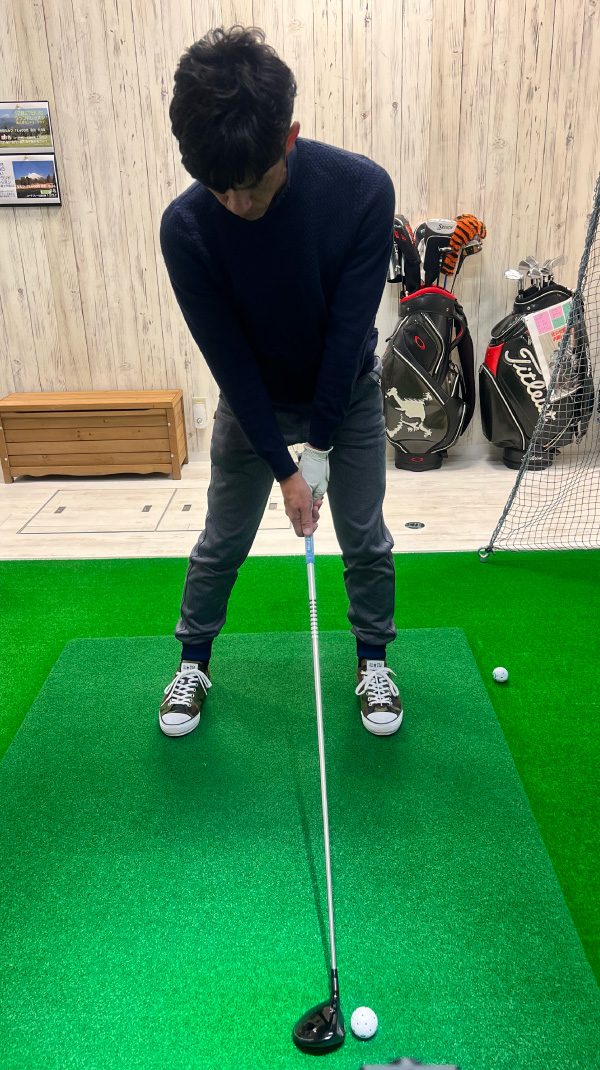 フェアウェイウッドのアドレスでは、手元位置が遠くなりがちです。ウッドは軽いから手元が浮いててもなんとかテイクバックができてしまいます。