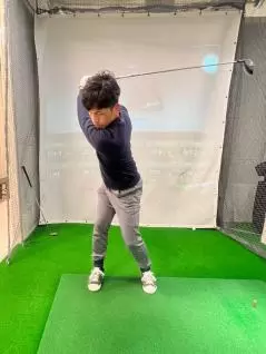 トップの位置は、正面から見た時に自分のおでこ辺りをシャフトが貫いているのが正しい位置です。初心者の方は、胸に腕をくっつけてテイクバックしてしまって、正面から見ると口の辺りをシャフトが貫いていることがあります。高い位置でエネルギーをためるのがトップの大原則です。