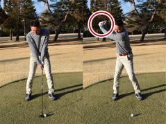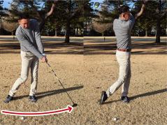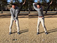 これで肩や腕から余分な力が抜けて、クラブヘッドの遠心力を利用しやすくなります。結果としてボールを横から払うイメージのスイングを実行しやすくなります。