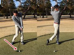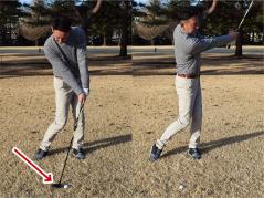 アドレスではクラブを通常よりも2〜3センチほど短く持ち、ボールを半個から1個分内側にセットします。自然にハンドファーストのアドレスとなり、ボールを上からとらえやすくなります。