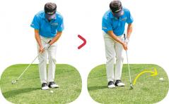 コロがしのメリットは、芝の抵抗を抑えてミスを少なくできること。短いクラブになるほどボールを右足寄りにセットし、ハンドファーストの形を作って振っていくように意識すれば、芝の抵抗を受けずにすむ。