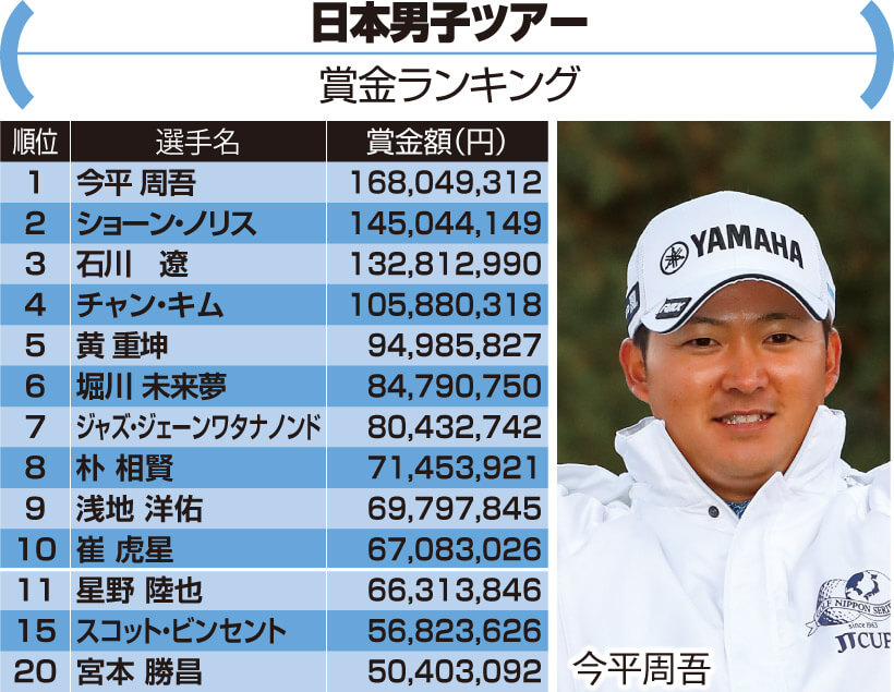 1年間で優勝は2回だけだったが、年間を通して一度も予選落ちがなかった今平が抜群の安定感で2年連続の賞金王になった。