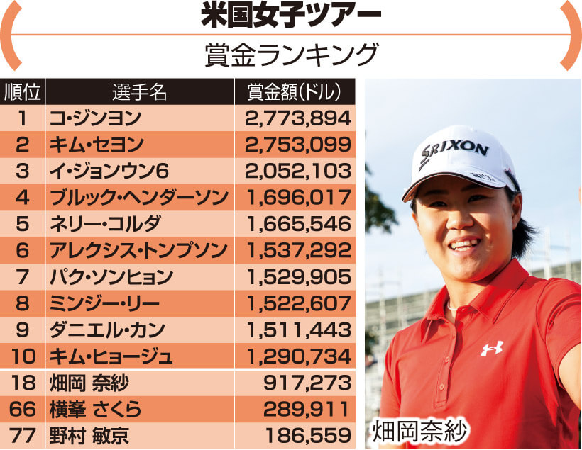米国挑戦3年目の畑岡は、米国ツアーでは年間1勝で賞金ランキング18位でシーズン終了。来年の目標は「年間3勝」と語った。