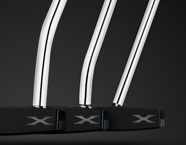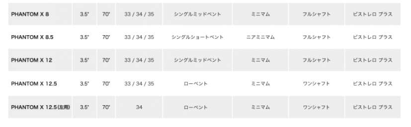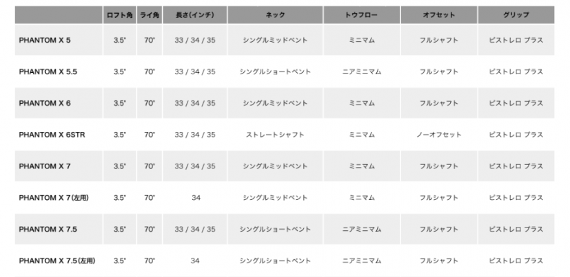 ファントムXシリーズのマレットパターには、ヘッドの形状に応じて「シングルミッドベンド」、「シングルショートベンド」、「ストレート」の3つのシャフトタイプが用意されている。「シングルミッドベンド」はすべてのヘッド形状に採用されており、フェースバランスに近い重心角を生む、トゥフロー設計となっている。またモデル名に「.5」がついたファントムX (5.5/7.5/8.5)には「シングルショートベンド」を採用しており、トゥフローをやや大きめにすることでストロークのアーク(フェース開閉)を促進する。この他、ファントムX 6STRには、さらに重心角が大きく限りなくフェースバランスに近くなる「ストレート」シャフトを採用している。