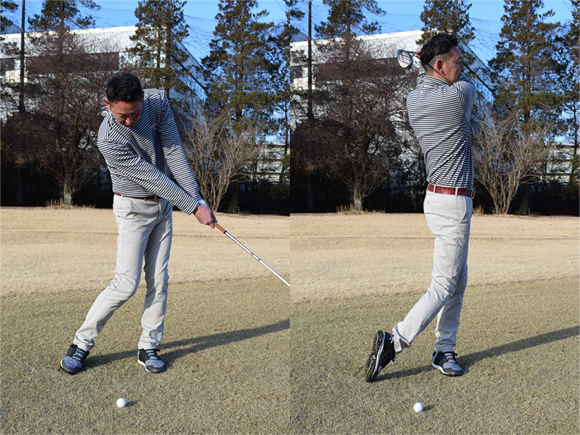 若干でかまいませんので、ハンドファーストのインパクトをイメージしましょう。これらの動作も前項同様、確認しながら行いましょう。
