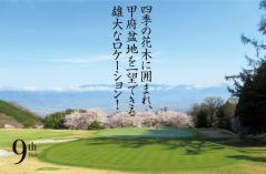 雄大な自然の地形を生かし、四季を通じて楽しめる丘陵コース。春になると市内周辺では、地元特産品の桃の花も咲き誇り、眼下に広がる甲府盆地の桃源郷の眺望も素晴らしい。