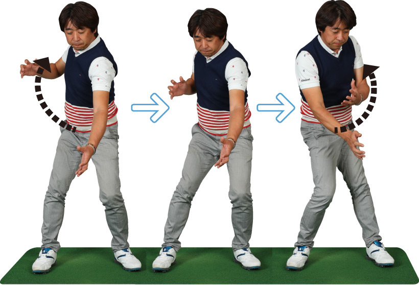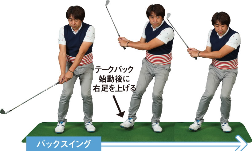 テークバックでは、クラブの遠心力が右前方に働くため、体の重心を左後方に動かすことでバランスを取る。首の付け根が左の股関節方向に移動するイメージを持つと行いやすい。