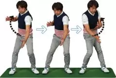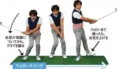上半身と下半身の時間差を感じるには、バックスイングで右足、フォローで左足を上げる「足上げスイング」がオススメです。体幹を使ったスイングで、捻転差が感じられます。