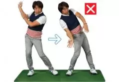バックスイングで、右に体重移動しようとすると、スエーやリバースピボットが起こりやすい。これではパワーは生まれないし、ミスヒットにもなりやすい。フォローで右に体重が残る「明治の大砲」の要因になる。
