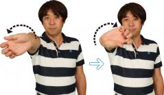 腕を「ネジる(=回旋)」と、どのような形になるのか。まず、胸の高さで両腕を真っすぐに伸ばし、右腕は内側に、左腕は外側に「ネジる」。これでフォローでの正しい手と腕の形が確認できる。