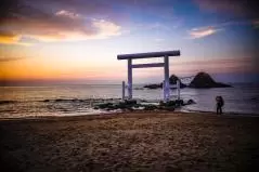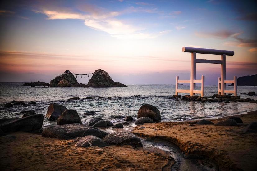 またの名を、桜井二見ヶ浦(さくらいふたみがうら)、筑前二見ヶ浦(ちくぜんふたみがうら)。玄海国定公園内に位置する海岸で、日本の渚百選や日本の夕陽百選に選ばれているところ。その海岸から約150m離れた海中にあるのが冒頭のとんがり君、というかとんがり君たち、夫婦岩です。