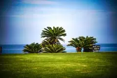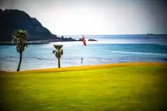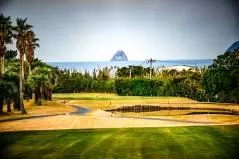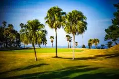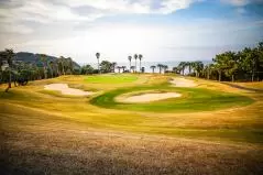INコースのほうが海が見えるホールが多かったかな。とりあえず1番PAR4は海に向かって打つべしのホール。グリーン手前にあるヤシの木が厄介なんだけど可愛いから許す。ここにどんどんどーんと松の木が並んでたらモーレツにイヤだけど、ヤシの木なら許す。だって可愛いもん。南国気分になれるもん。