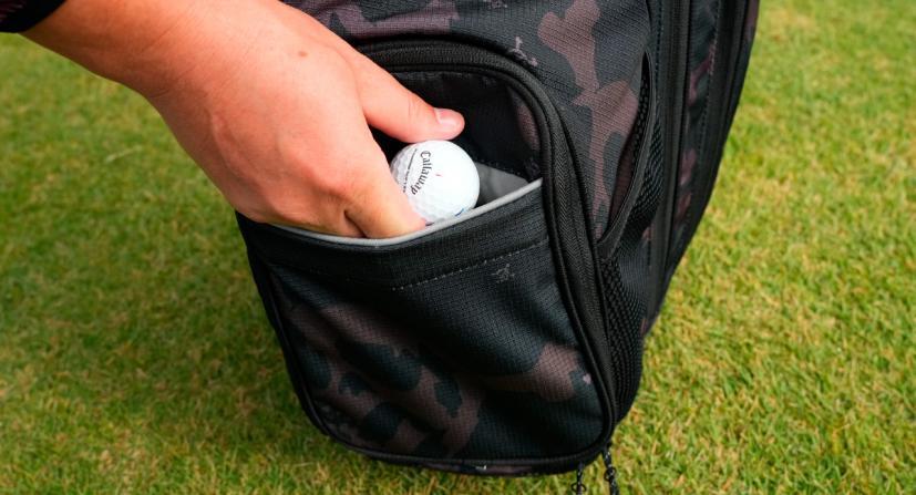 キャディバッグには、たいていポケットや収納が装備されています。ゴルフボールやティー、マーカーといった小物からレインウェアや防寒・防暑グッズなどを入れたり、ラウンドに必要なものを収納出来ます。