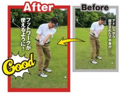 広いスタンスで下半身を固めてしまい、フットワークが使えず、腰も止まってしまい、手でクラブを上げていた。