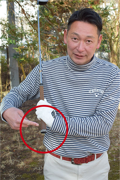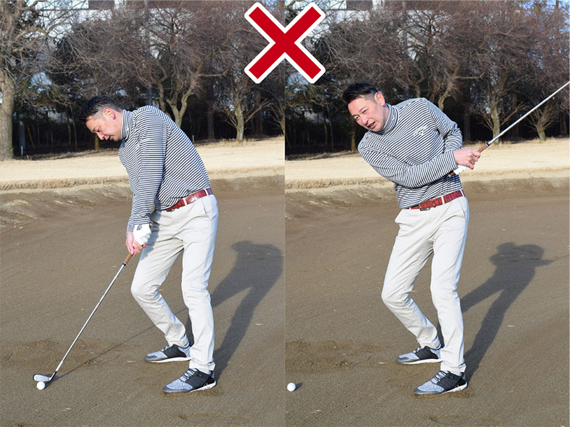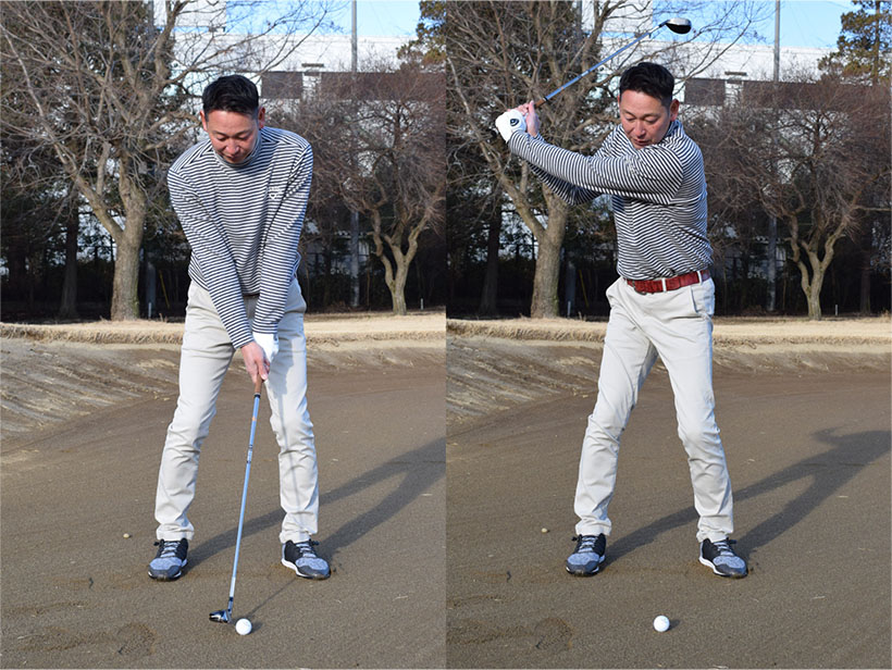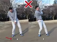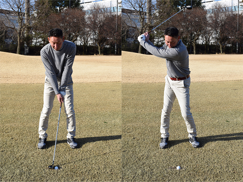 ボールから離れてハンドダウンに構えるのは避けましょう。スイング中に手首をこねやすく、しかもインパクトでヒールが地面に当たって振り抜きがスムーズにいかなくなるためです。
