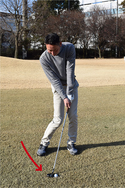 ボールの近くに立って構え、パット感覚で低く転がそう