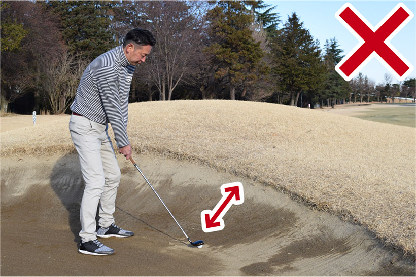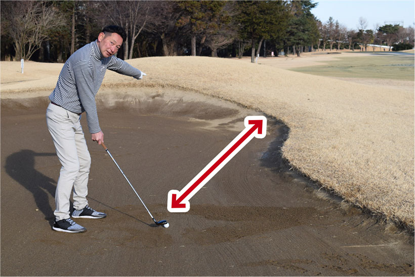 ただし、ボールの周囲の状況をよく確認することが大切。ユーティリティクラブが使えるのはボールが砂の上にきれいに乗っていて、ボールからフェアウェイバンカーのアゴまでの距離が十分にあり、アゴがあまり高くないことが条件です。
