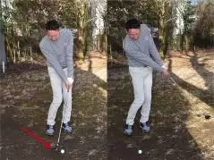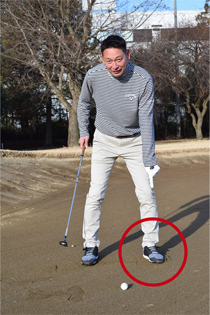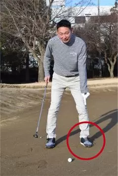 ユーティリティクラブが使えると判断できたら、クラブを短めに持ち、通常のスタンスから左足を右足よりも少し深く埋めて構えましょう。ディボット跡からのショットと同じようにボールを半個から1個ぶん内側にセットします。