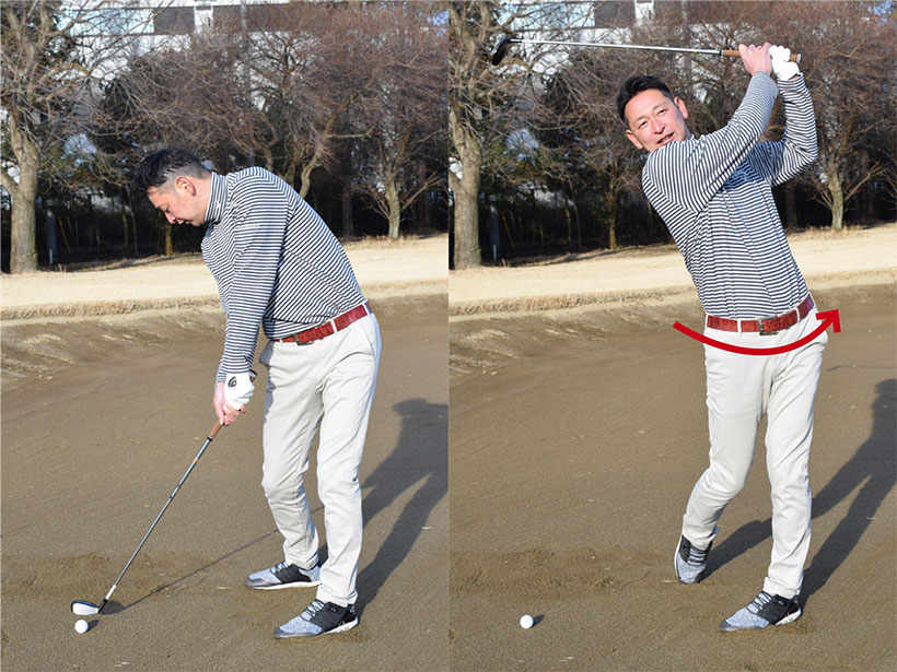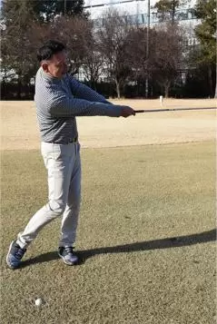 正確にヒットできれば距離を稼げますが、飛ばそうとしてクラブを振り回してはいけません。だからといって、きちんと当てようとしてボールに合わせるような打ち方になってもダメ。力感を7〜8割くらいにセーブしてコンパクトに振る意識は大事ですが、インパクトからフォロースルーにかけて体重を左足に乗せて腰をしっかり回転させるイメージを持ちましょう。