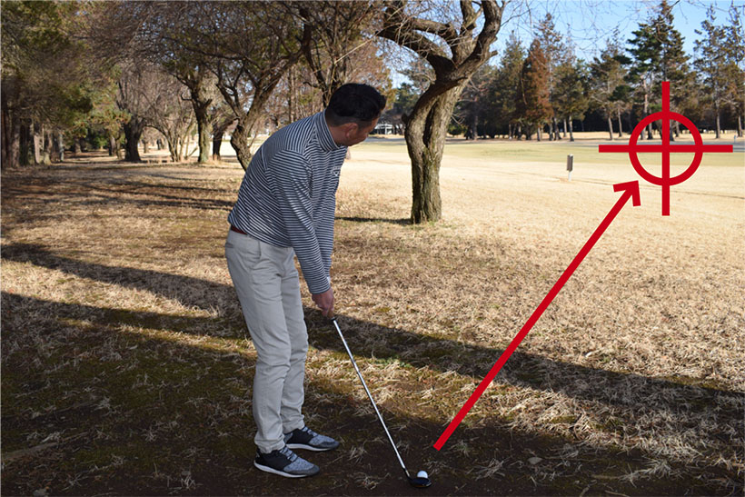 ディボット跡からのショットはボールを内側に置いてダウンブローに打つ