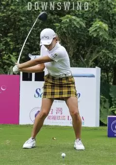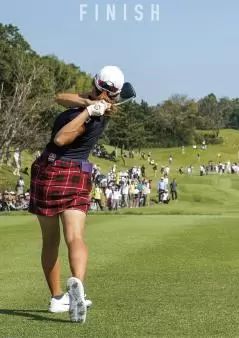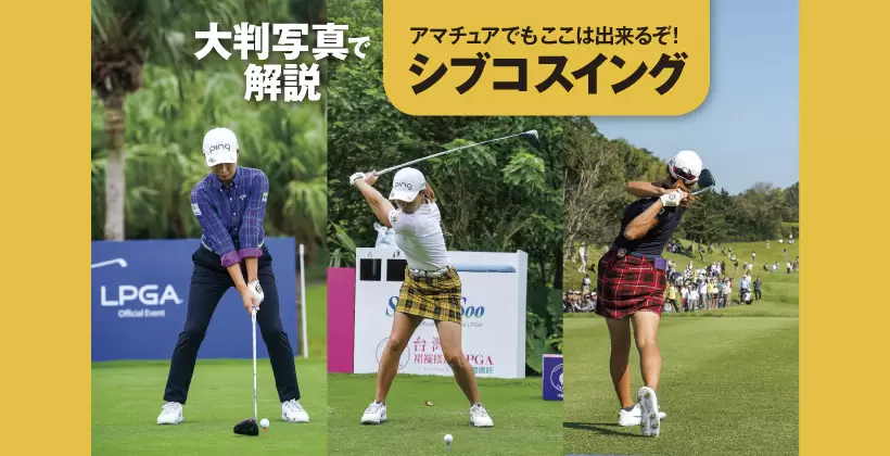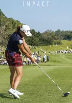 アマチュアにはインパクトで上半身が前に倒れて、突っ込んでしまう人が多い。それを解消するポイントは左のお尻。渋野のようにインパクトで左のお尻を少し後ろに引いて上半身を回すことで体が前に倒れなくなって、前傾角度をキープしたままインパクトできる。ここでも左腕は一直線に伸びたままなので、窮屈なインパクトにならない。