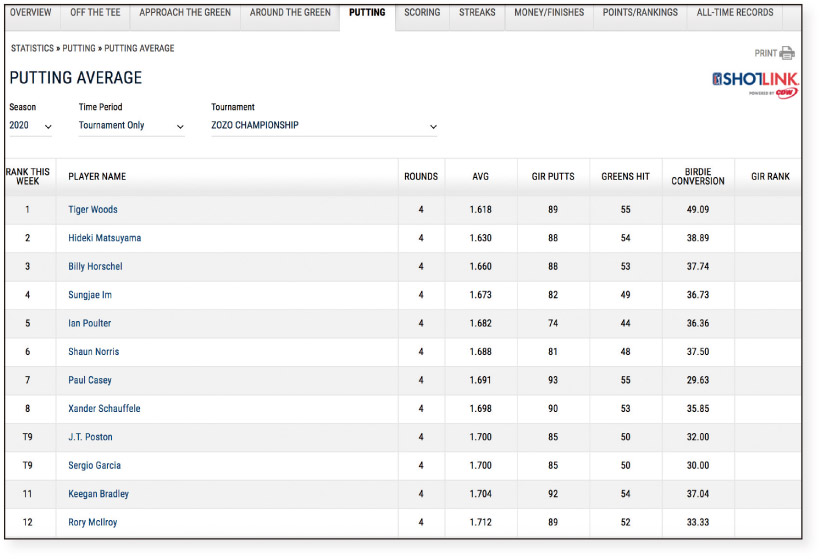 松山英樹選手やタイガー・ウッズの活躍を、テレビやネットで楽しんでいる読者の皆さんに是非見ていただきたいのはPGAツアーの公式サイト。リアルタイムでスコアを確認できるのはもちろん、すべての出場選手の各ホールでのすべてのショットの軌跡も確認できる。また、ハイライト動画や注目選手のインタビューなど動画も充実。そんな魅力的なサイトの中で今回特に注目したのは「STATS」。ポイントランキング、平均ストローク、平均パット、ドライビングディスタンスなどの部門別データのことだ。
