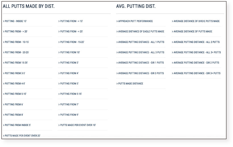 PGAツアーの「STATS」はかなり細かいことも、データ好きにはたまらない魅力だ。例えば平均パット数だけだとショットがめちゃくちゃ良くてピン近くに寄せていたのでパットが入っていたのか、それとも長いパットなども入れていたのかが分からないが、PGAツアーでは距離に応じた平均パット率を出している。さらには残り飛距離に応じたショットの精度のデータなどもあり、様々な視点から選手や試合結果を分析できる。