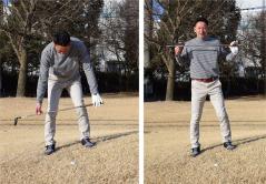 斜面と平行に立ちすぎた構えの場合は、バックスイングで頭が下がり、ダウンスイングはその反動で上体が起きてしまいやすいのです。