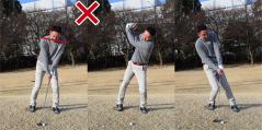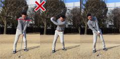 バックスイングで上体が右に流れて、ダウンスイングで元に戻そうとして上から打ち込んでしまうことになりやすいためです。これではクラブが抜けなくなり、ダフリが生じます。