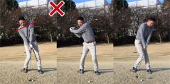 斜面に逆らった構え方ではバックスイングでクラブをインサイドに低く引きすぎて、その反動によってダウンスイングではクラブがアウトサイドから下り、インパクトでは上体が突っ込みやすくなります。