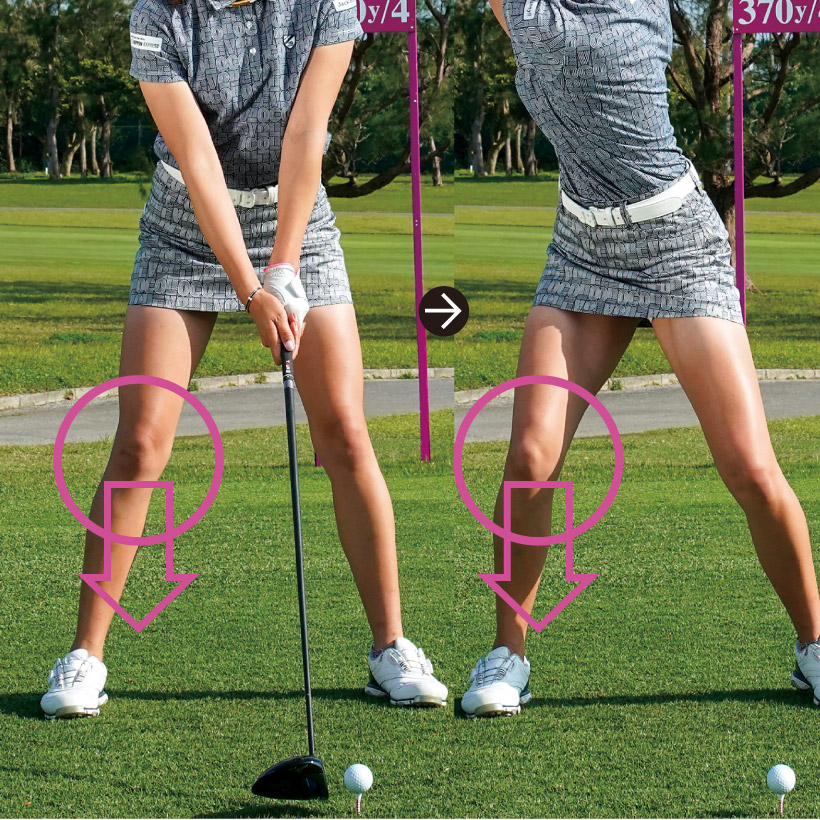 原選手のダイナミックなスイングを生んでいるのは、力をためることができるトップであり右ヒザ。アドレスからトップまで右ヒザは常に正面を向くのがポイントです。