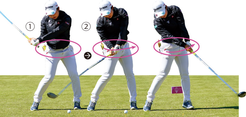 ①ただ腰を回転させるのではなく、お尻の左後方を上に吊り上げていくことで右肩の突っ込みを抑える。