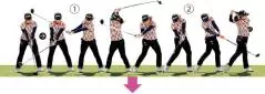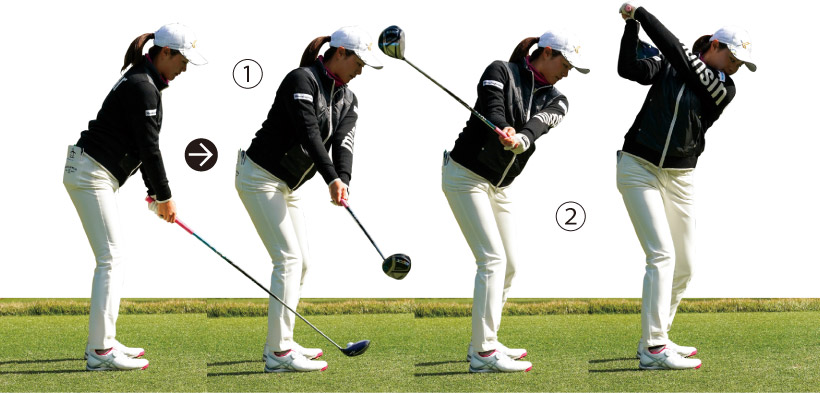 ①手首を使わずに、両肩を回しながらクラブを上げる。