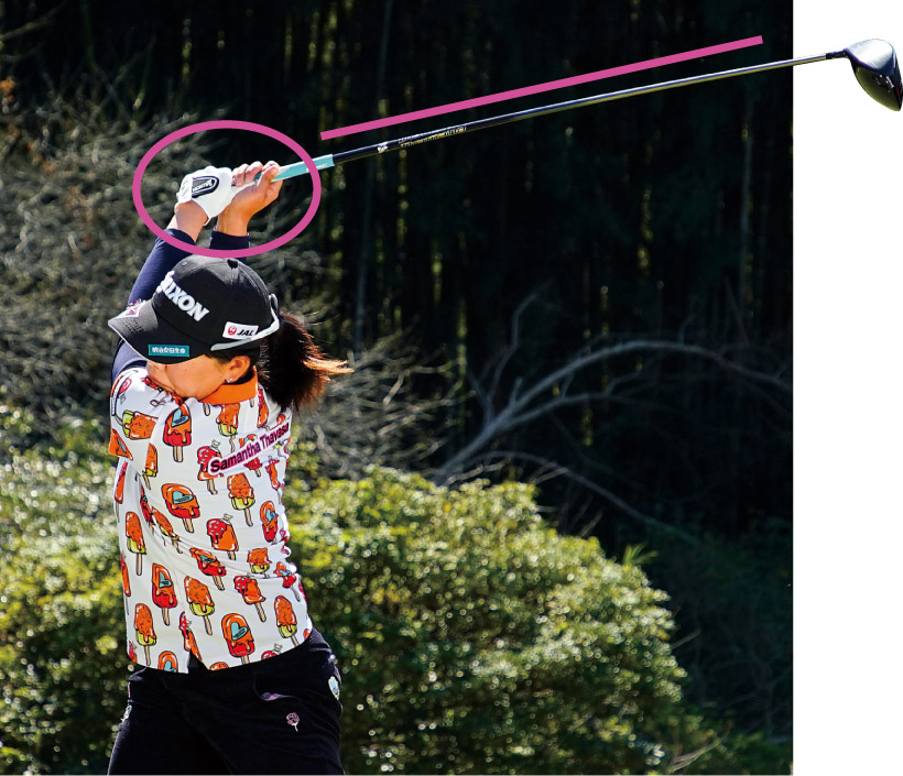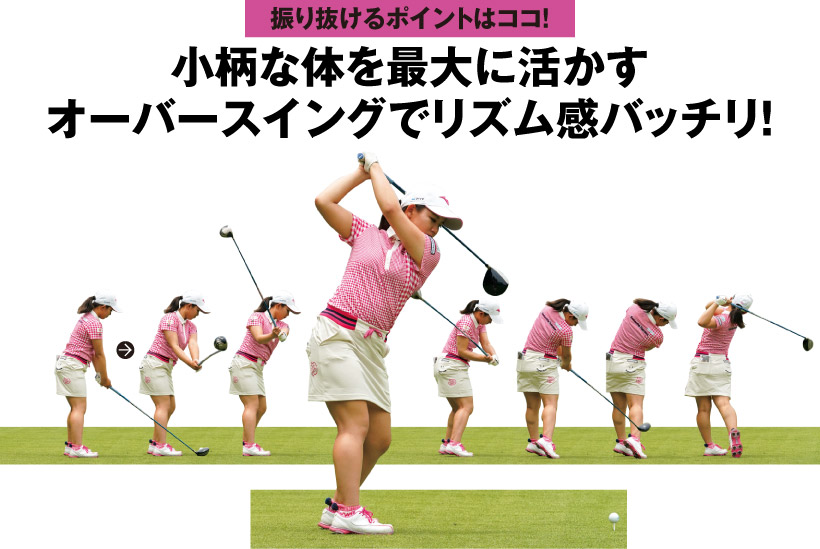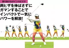 小柄な分、インパクトでは両ヒザを思い切り伸ばすことで、ヘッドを走らせてヘッドスピードを上げている。ヒザを伸ばす反動でヘッドと自分の頭が引き合っている形を作ることも、振り抜ける要因となっている。
