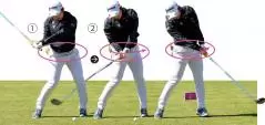 ②ダウンスイングでも手首の形をそのままに体で回転するスイング。