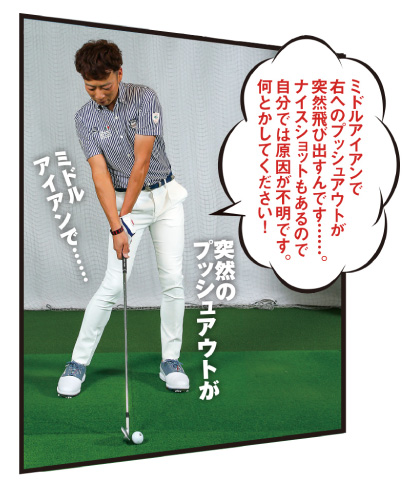ミドルアイアンで右へのプッシュアウトが突然飛び出すんです……。